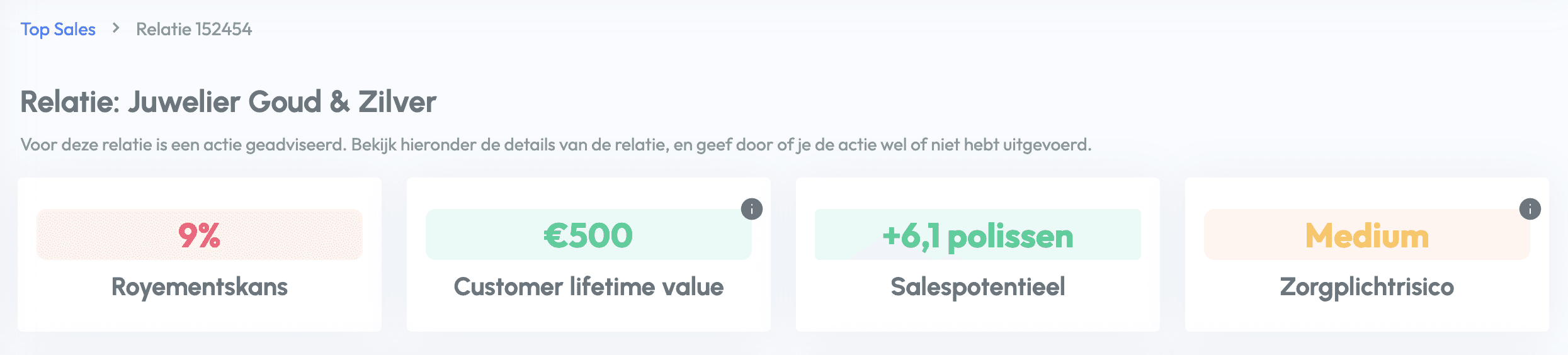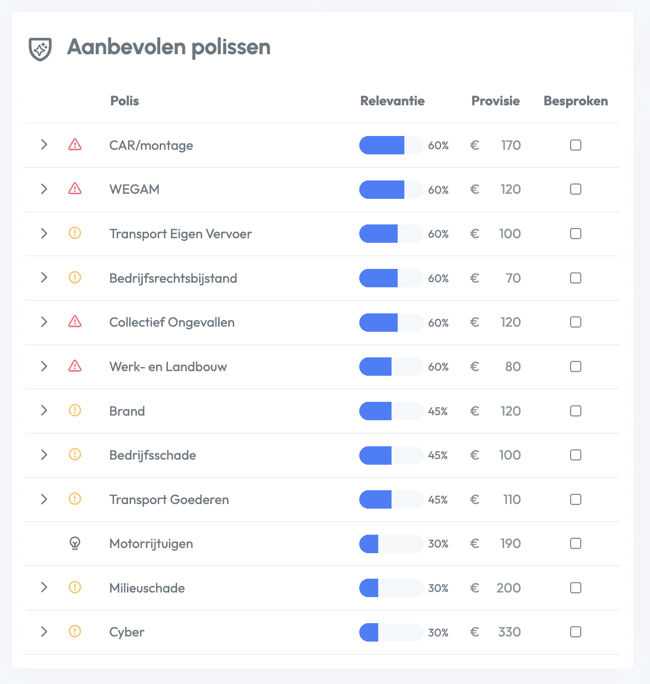 Das neue Risikomodul ist in der Beta-Version verfügbar. Das Risikomodul umfasst eine eingehende Analyse für Geschäftskunden und deren Risikoprofil. Wo möglich, werden ungedeckte Risiken mit Versicherungsgruppen verknüpft. Für jedes Risiko gibt es eine Angabe zur Dringlichkeit, eine ausführliche Begründung und einen Stufenplan, um dieses Risiko mit dem betreffenden Kunde zu besprechen.